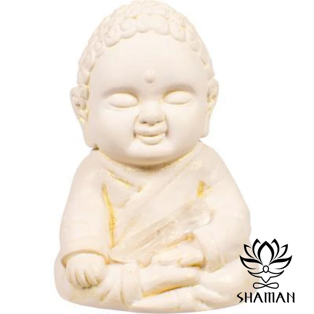 Notre précieux petit Bouddha est représenté dans la pose touchant la terre avec un cristal clair sur ses genoux. Cet article est fabriqué à partir de gypse naturel qui ne contient aucun produit chimique nocif.