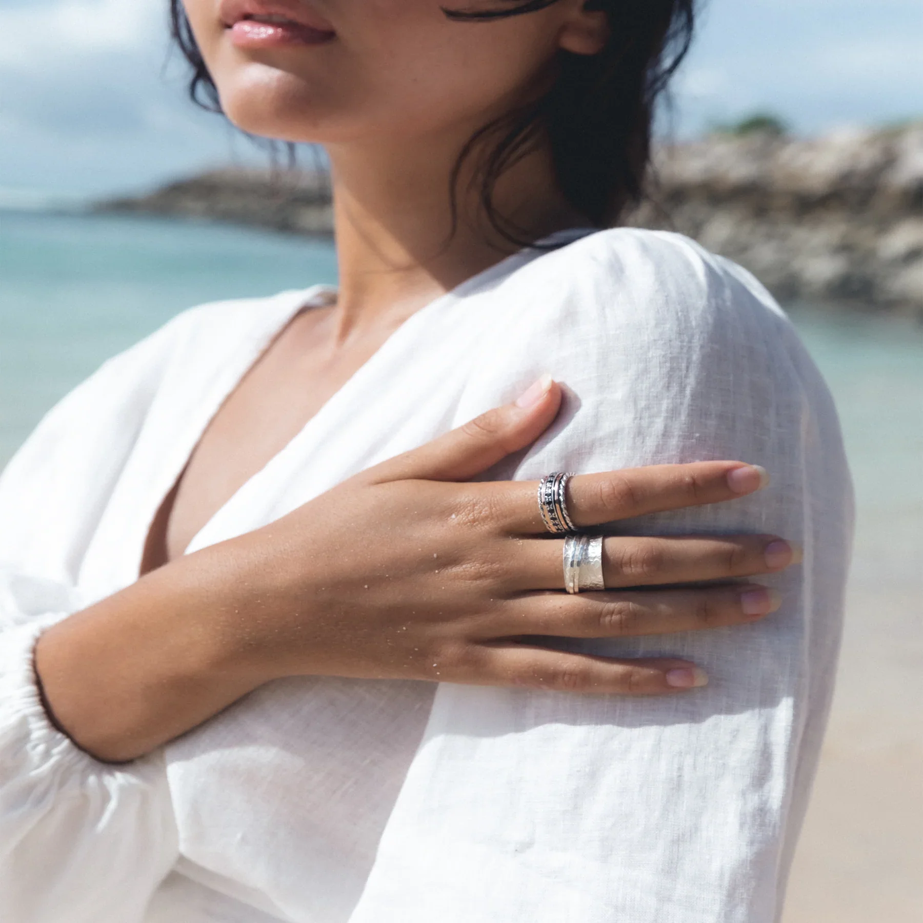 Bague de méditation en argent sterling brossé filigrané avec deux anneaux rotatifs.