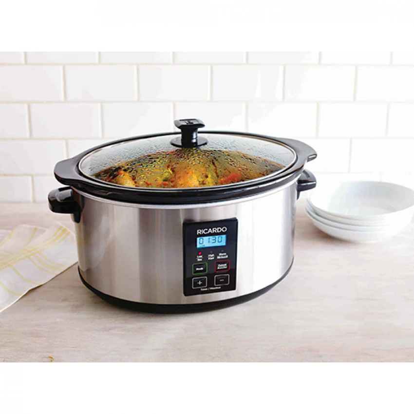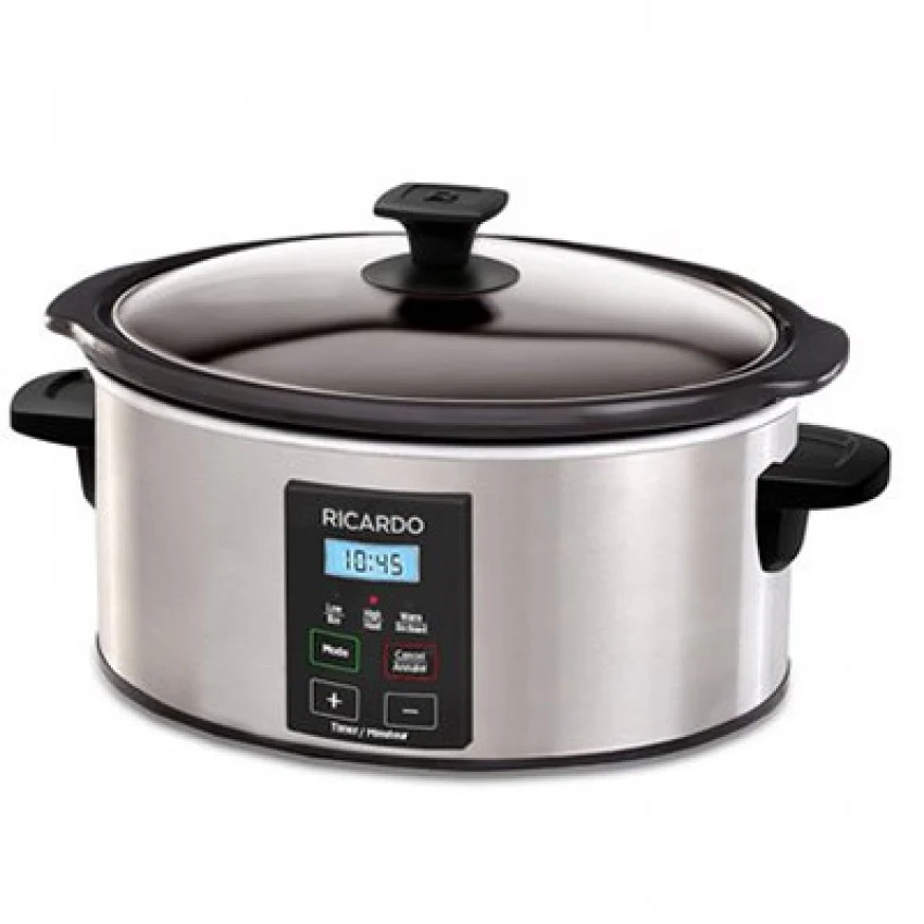 Mijoteuse programmable avec marmite sécuritaire pour la cuisinière, elle comporte 3 modes différents et elle passe automatiquement en mode réchaud lorsque la cuisson est terminé. Le temps de cuisson peut être programmé entre 30 minutes et 12 heures. Elle est facile à utiliser, il suffit d’appuyer sur « démarrer » puis de régler le minuteur avec les boutons sur le dessus de l’appareil. La taille de 5.5 litres est parfaite pour 1 ou 2 personnes.